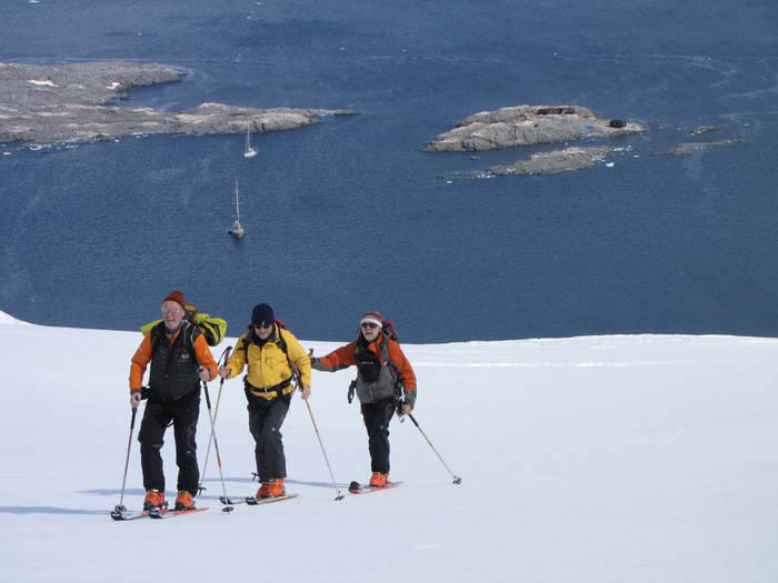 Next day we made a quick, but careful ski descent reigning in the pulks with back ropes all the way down to the shore. Pelagic Australis was standing by at anchor and Swiss Chris was there to meet us in the Zodiac. After a champagne toast to our selves on the beach (we carry plastic champagne glasses for such occasions) followed by the Zodiac ride to the vessel, we had a quick pow wow and decided to strike south into Crystal Sound and possibly further south to Marguerite Bay, via ‘The Gullet.’ The weather was still holding and this was an opportunity to make the run, while the mountain team took a break.