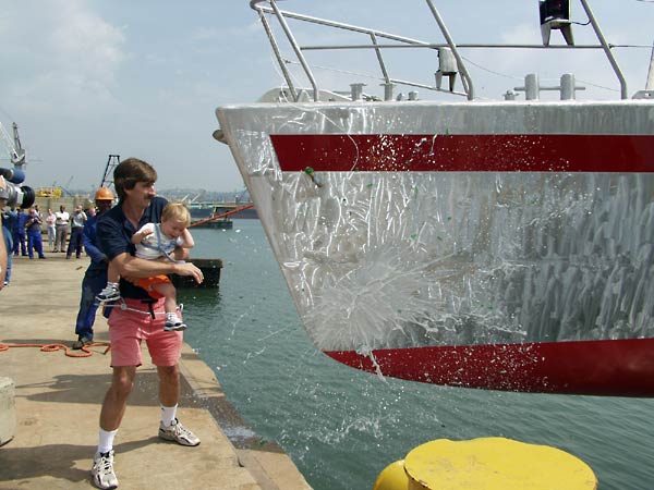Skip’s 16 month old daughter Lara Thetis Australis broke the bottle over the port bow (scaring herself in the process) and the 74 foot expedition vessel was soon floating to a great round of applause from the team at